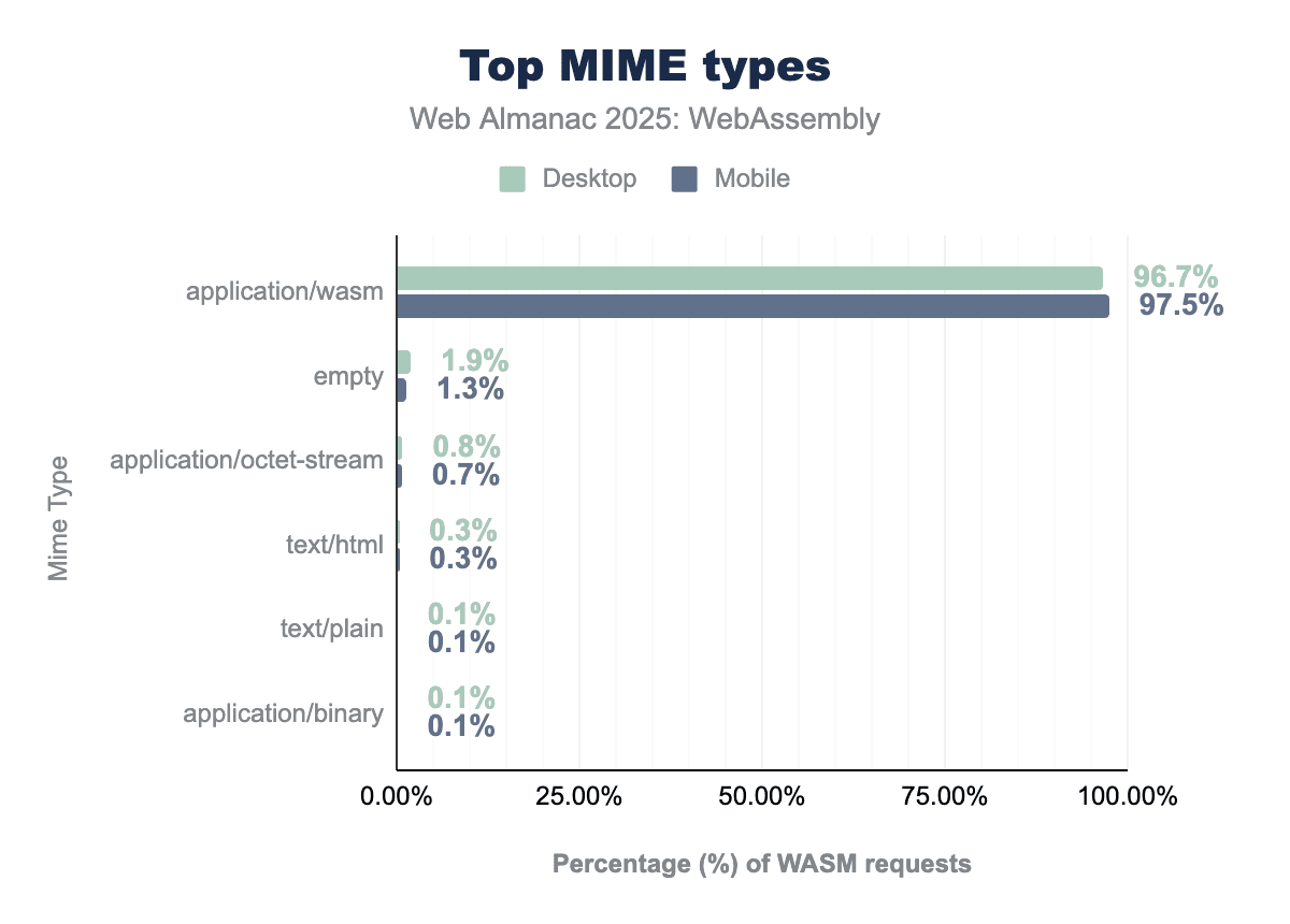 Some requests lacked a Content-Type header, and some had incorrect MIME types, such as text/html or text/plain. These account for 3.2% and 2.4% of requests, respectively. Compared to 2022, these percentages have dropped significantly, indicating increased awareness in setting the correct MIME type for WASM applications.